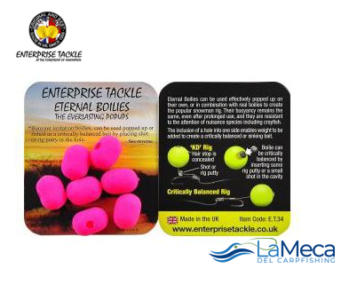 Los Enterprise Tackle Eternal Boilies Dumbell representan la evolución en señuelos inteligentes para carpas cautelosas. Su diseño patentado con orificio lateral permite: