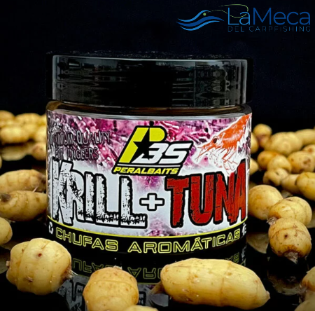 Bote de chufas peladas en tamaño grande seleccionadas con sabor Krill Tuna de la marca Peralbaits.