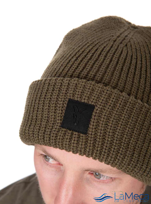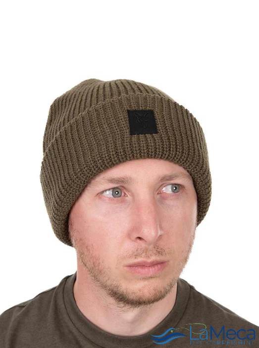 Gorro de lana merino de la marca Fox, en color verde oliva, especial para la pesca de carpfishing.