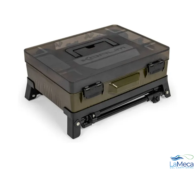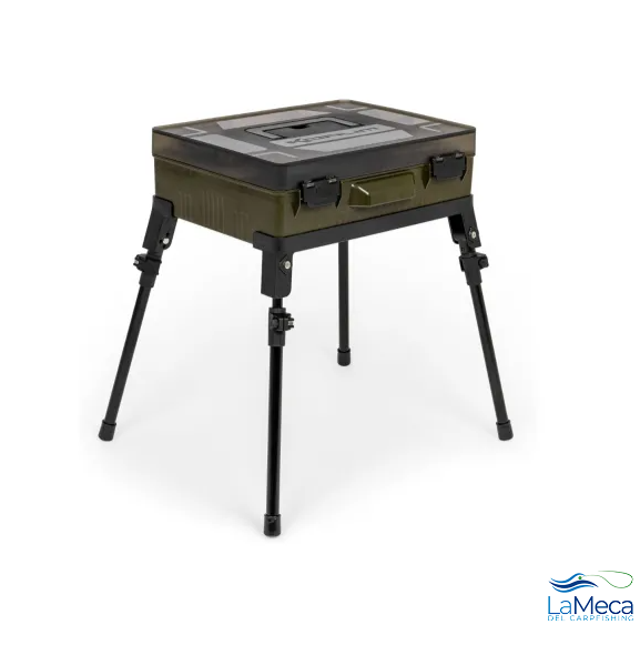 Viene con patas telescópicas, lo que le permite tener la unidad a una distancia alcanzable de la manos cuando se pescando desde una silla, o quiere mantener todo súper organizado cuando se pesca desde un bivvy. Viene con un asa de transporte duradera, asa de agarre lateral, clips de seguridad y junta.