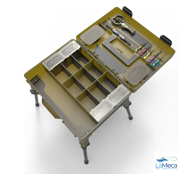Las herramientas de cebado, el desanzuelador y las tijeras encajan perfectamente en su sitio, mientras que la caja principal puede ajustarse con divisores para adaptarse a tus necesidades.