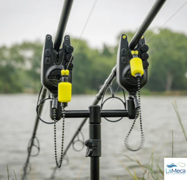 Juego de alarmas VTX+ para 3 cañas: incluye tres detectores y un receptor, acompañados de estuches rígidos con cierre, un cordón para el receptor y un destornillador.