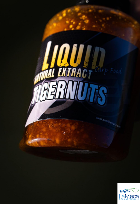 Extracto natural de la marca Pro Elite Baits sabor Tigernuts, perfecto para intensificar el sabor de todo tipo de cebos artificiales; maíces, chufas, cacahuetes, especial para la pesca de carpfishing.