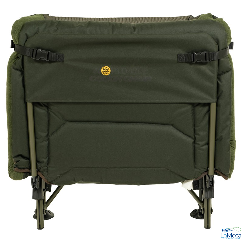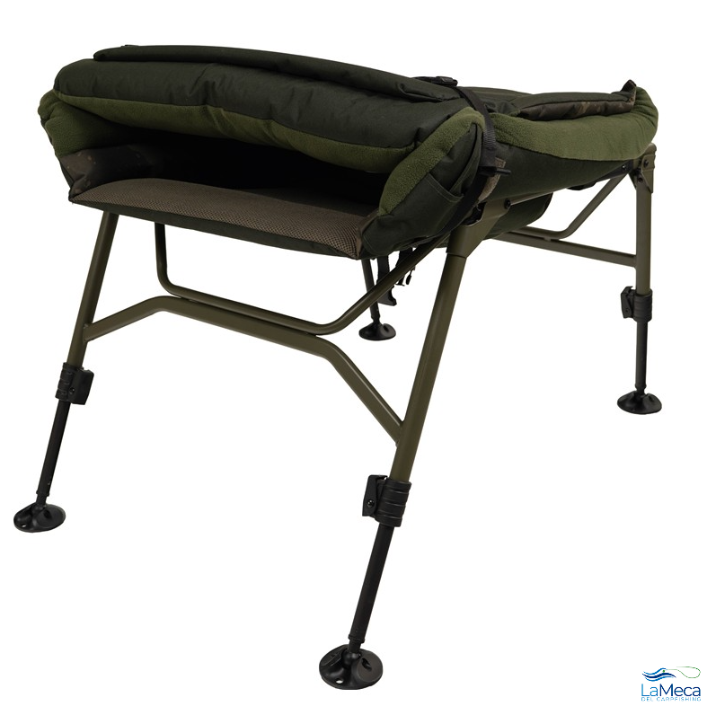 Silla de la marca Solar, modelo WorldWide Couch, en color verde y camo, perfecta para la modalidad de pesca carpfishing.